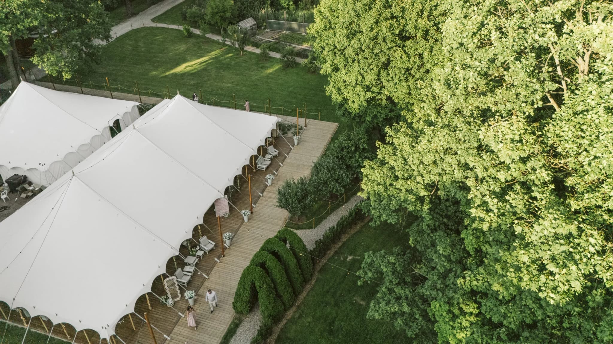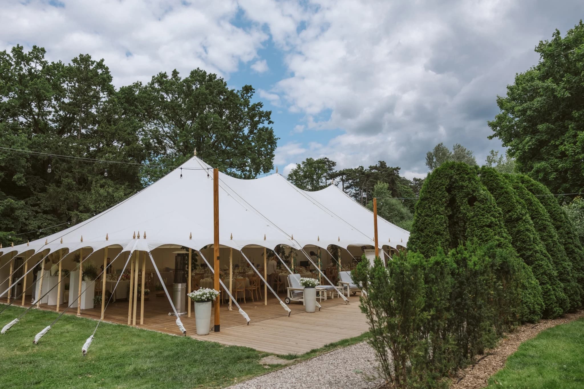 Jestem ogromnie szczęśliwa, że mogę Wam przedstawić jedną z moich ulubionych realizacji sezonu 2022. Cyrkowy namiot sprawdził się znakomicie w ogrodzie. Beżowy materiał i drewniana konstrukcja po prostu mnie zachwyciła. Naturalne elementy doskonale wtopiły się w piękny ogród. Dzięki podwieszanym girlandom oraz naturalnym oplotom wokół konstrukcji namiotu udało nam się zaprosić ogród do środka.